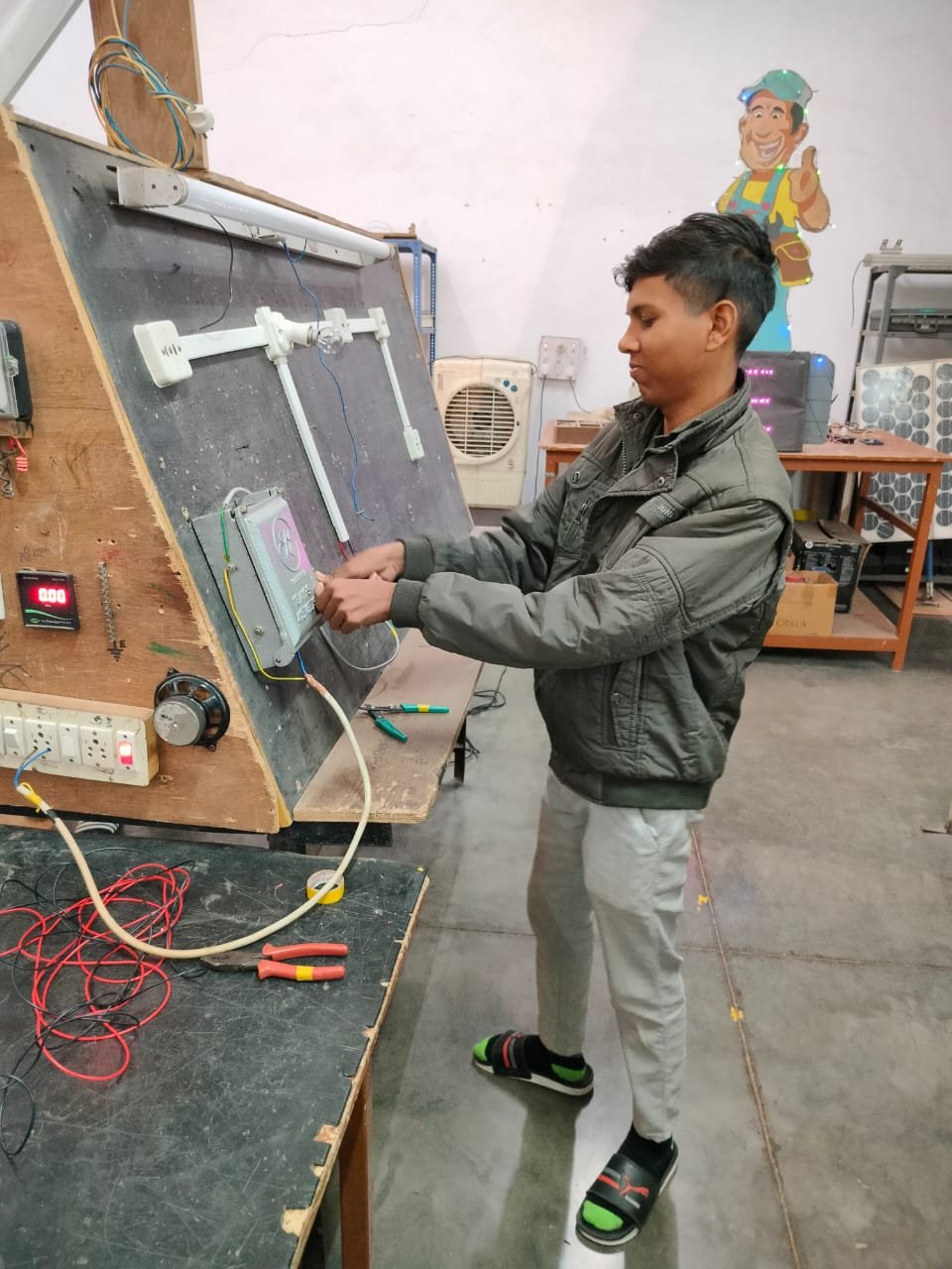 | 4 | Drilling holes on walls, PVC Sheets by Portable drill machines. Making boards for switches. | Basic electrical concepts, AC, DC, single phase, 3 phase supply, voltage current, power and energy and its relationship. Ohm's law. Knowledge of measurement of current, voltage, power using voltmeter, ammeter, wattmeter, energy meter, meager, etc. |
